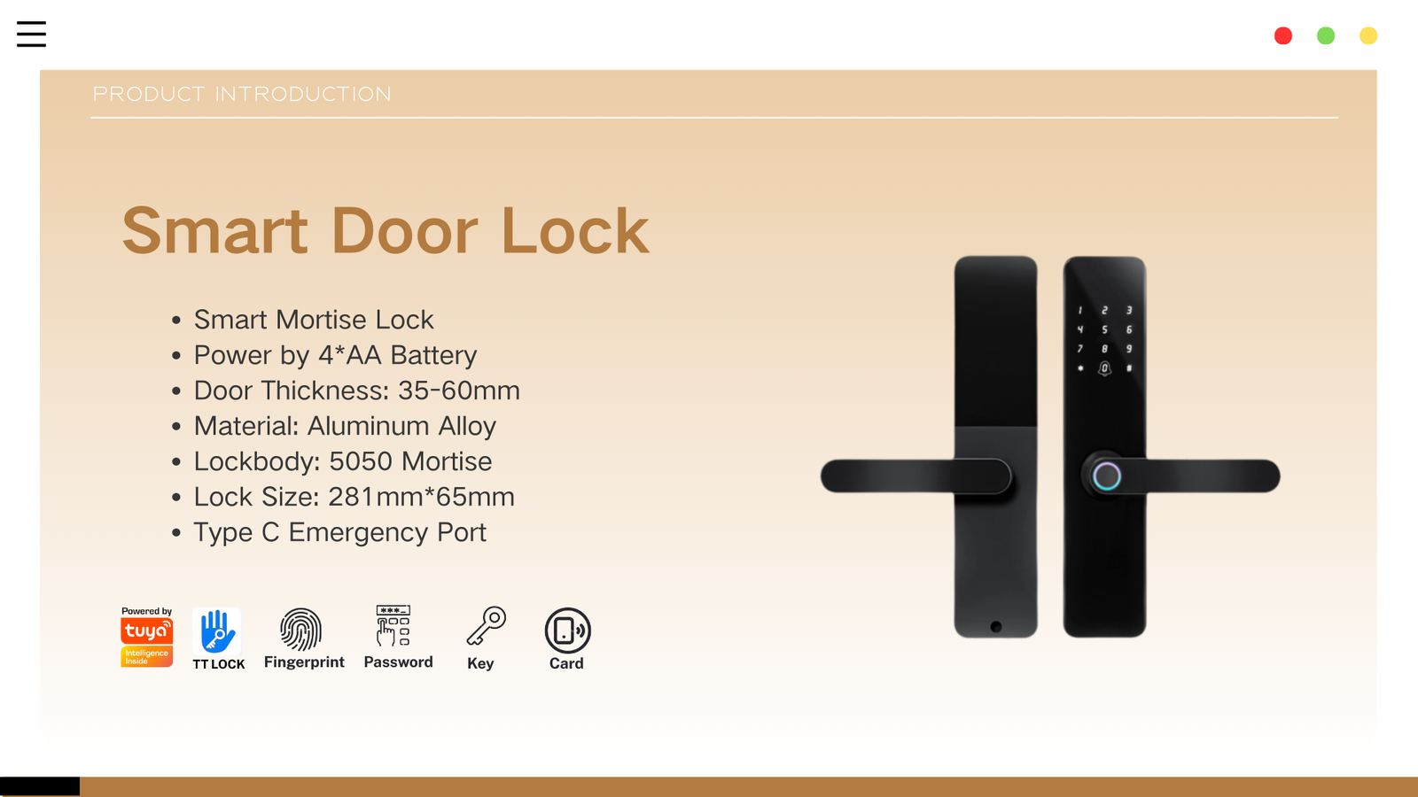 The Smart Door Lock—KF02 is engineered around the reliable and versatile 5050 Mortise Lock Body, ensuring strong mechanical performance and broad compatibility with standard door preparations.