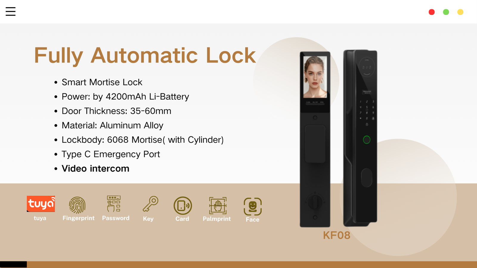 Today, we redefine seamless access with the launch of the KF08, a fully automatic smart lock engineered to be the ultimate guardian of your home. Combining advanced biometric security with integrated video communication, it offers the most comprehensive and convenient entry experience available.